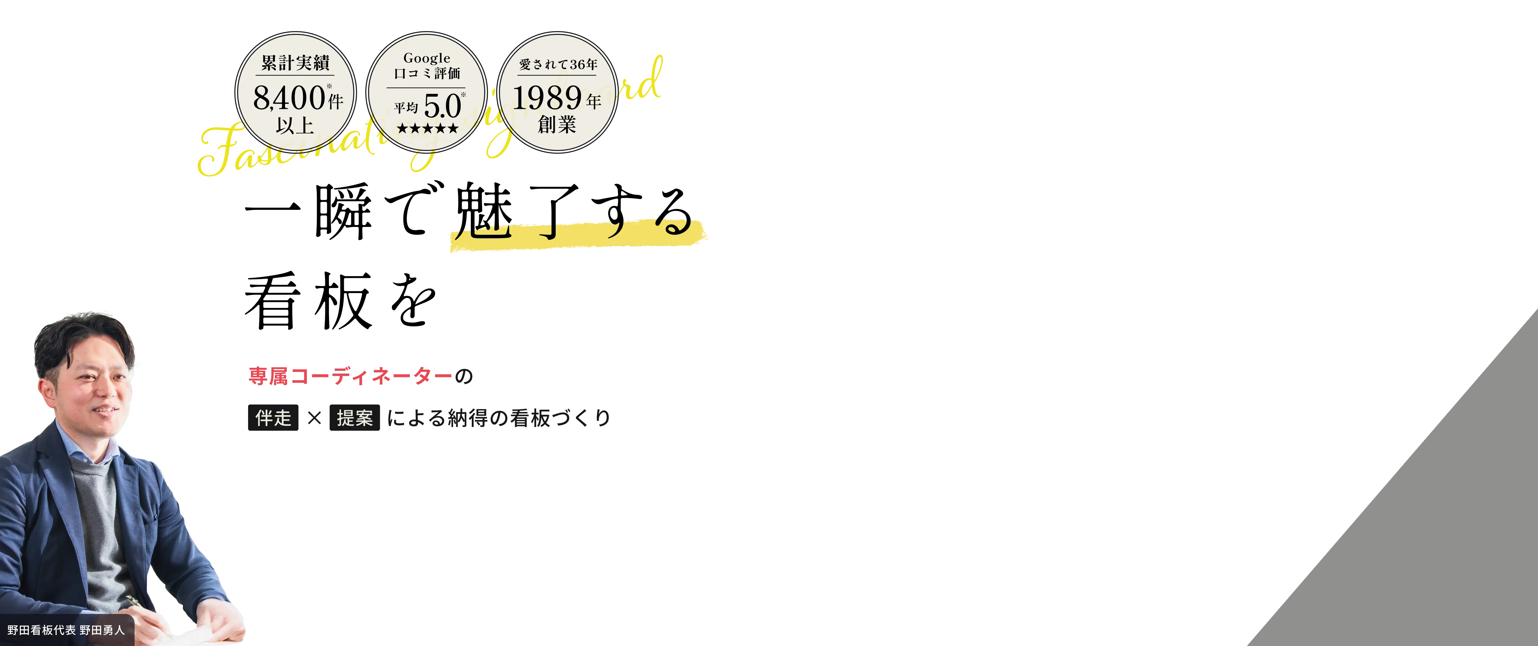 最大の違いは「専属コーディネーター」が最初から最後まで伴走することです 。お客様の「想い」を職人に的確に伝え、提案力と技術力を合わせることで、「理想のデザイン」と「確かな品質」を兼ね備えた看板を実現します 。創業36年、累計8,400件以上の実績が信頼の証です 。